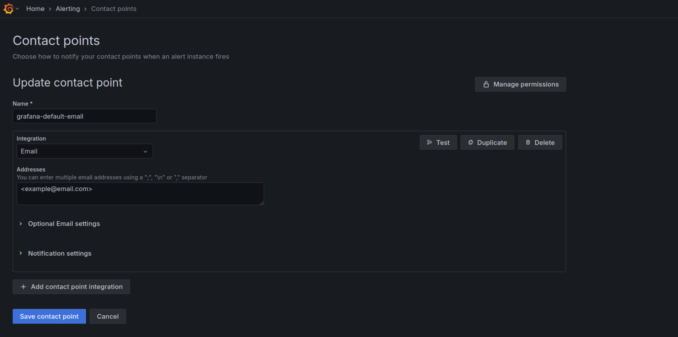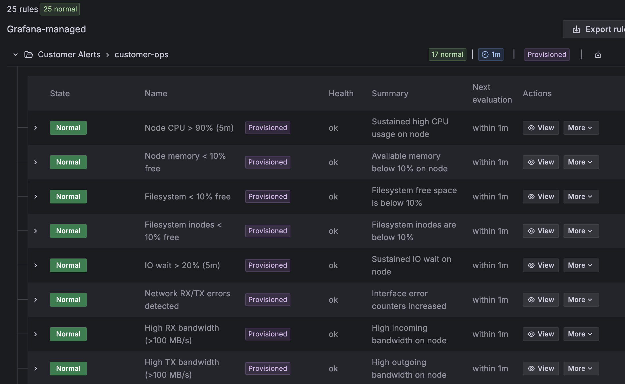 The cluster is also pre-configured with several alerting rules, which can be viewed under the Alerts tab. Hardware-related alerts are automatically forwarded to Verda for faster resolution. Additional alerts can be created and customized to notify through Grafana’s contact points by editing the grafana-default-email channel. This allows customer-specific alerts to be routed to any contact point defined by the customer directly within the Grafana UI.