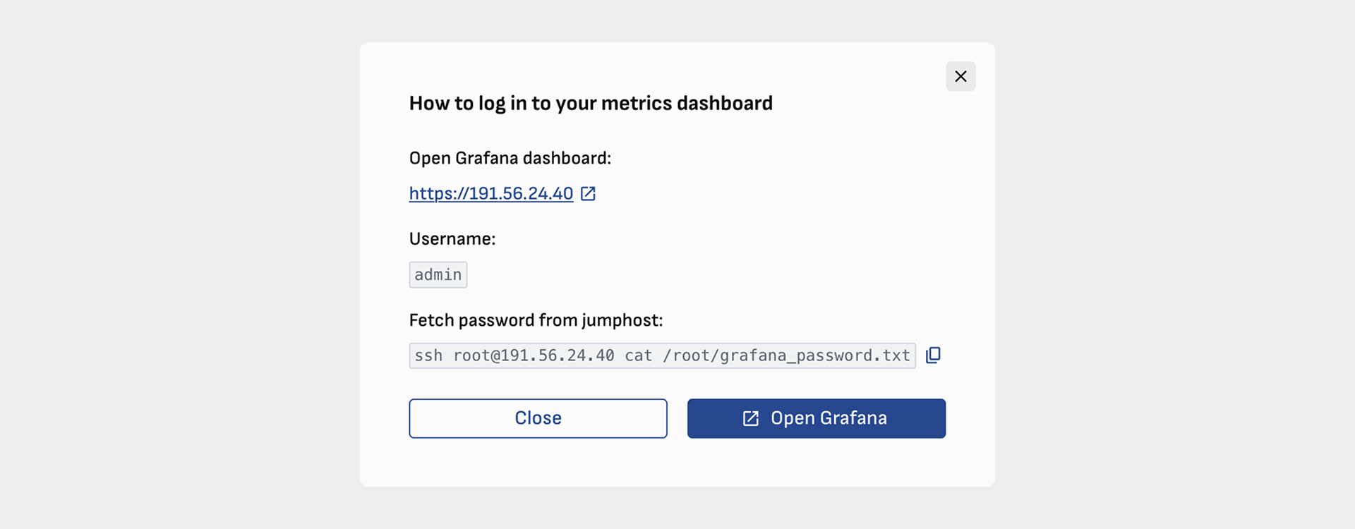 To access the Grafana portal, follow the provided instructions to obtain the address and login details. If prompted with a certificate warning (common with self-signed certificates), select Advanced and then Proceed to … to continue. The password can be retrieved from the jump host.