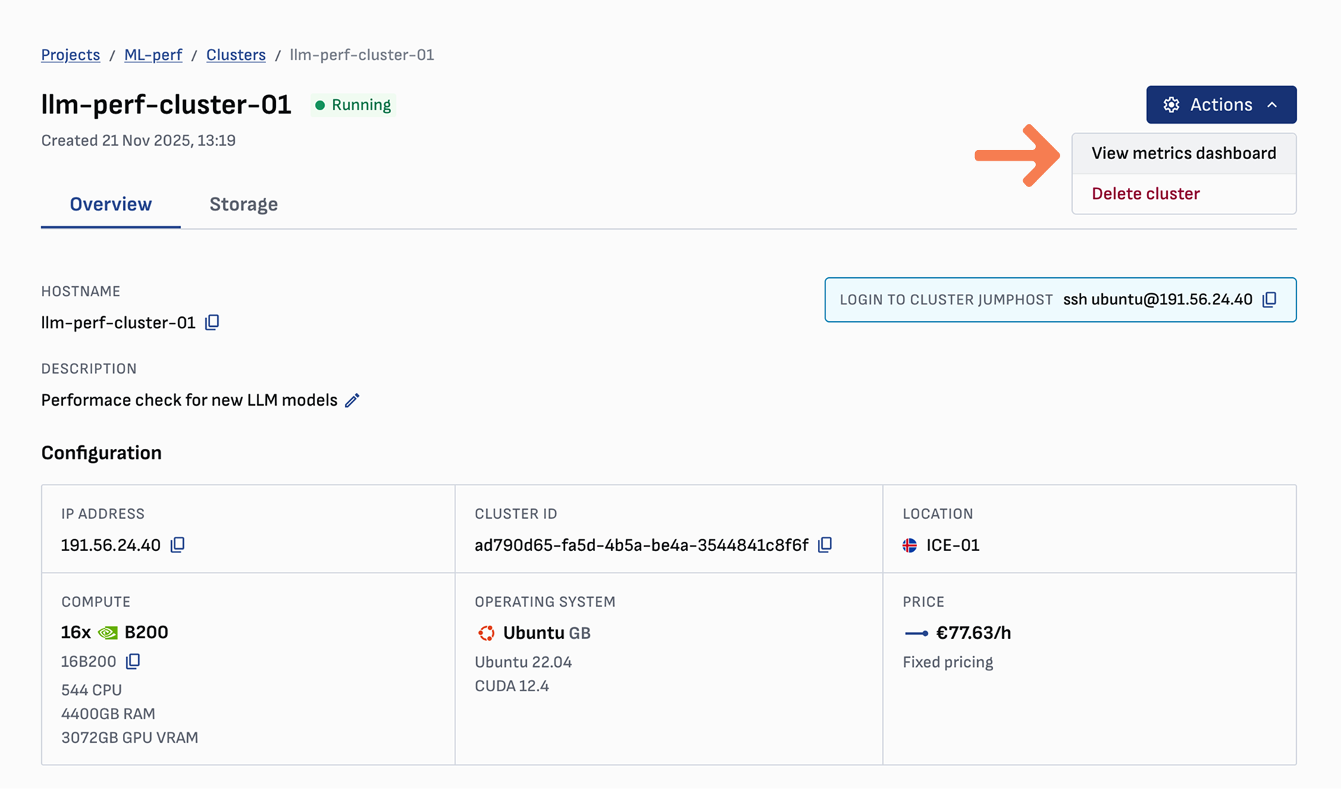 To access the dashboard navigate to the cluster dropdown and select View metric dashboard.