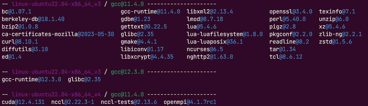 To use modules from both HPC-X and Spack, run module use /opt/hpcx/modulefiles /home/spack/spack/share/spack/lmod/linux-ubuntu24.04-x86_64/Core.