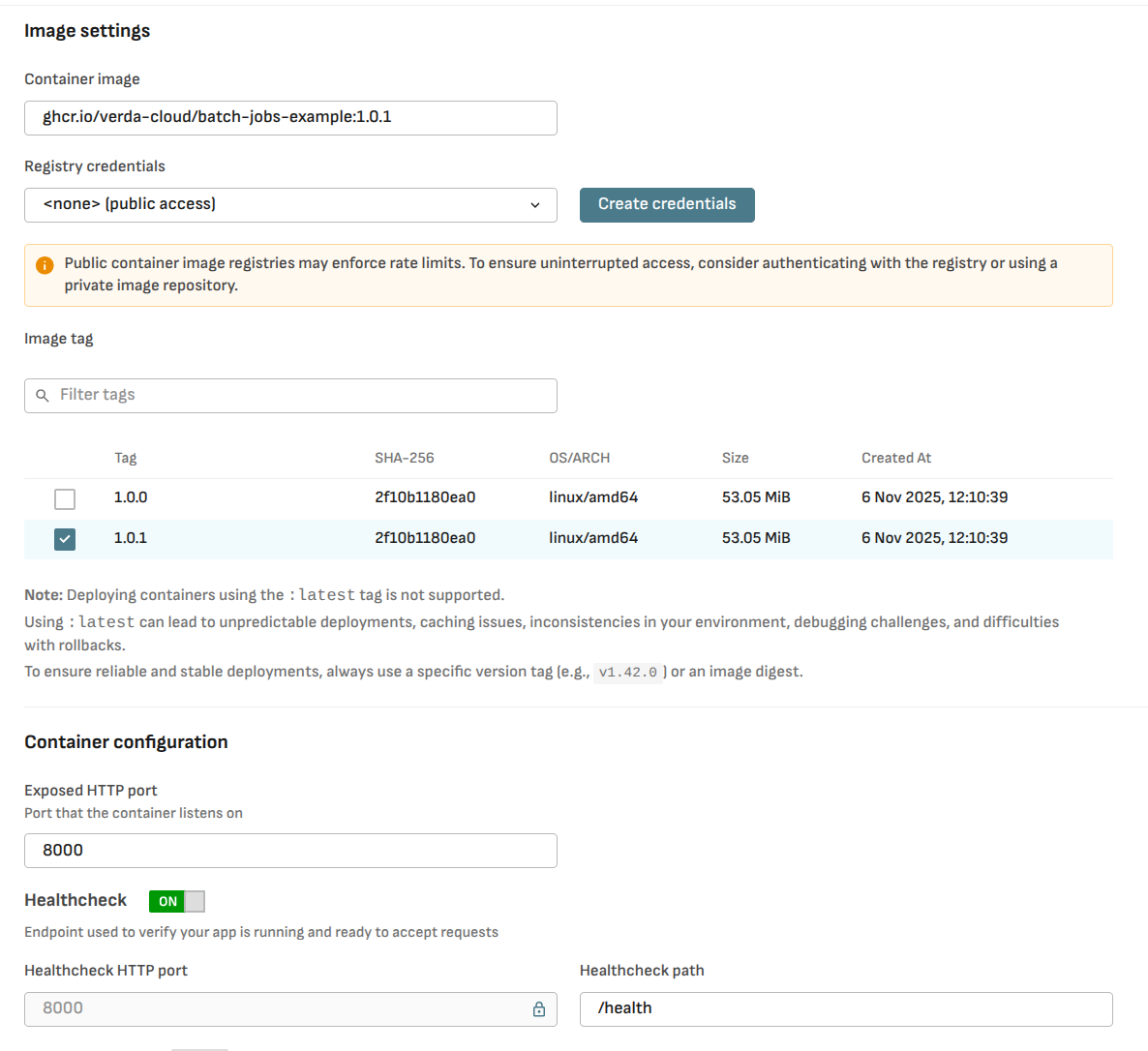 For the container image, we will use the example app public docker image ghcr.io/verda-cloud/batch-jobs-example:1.0.1