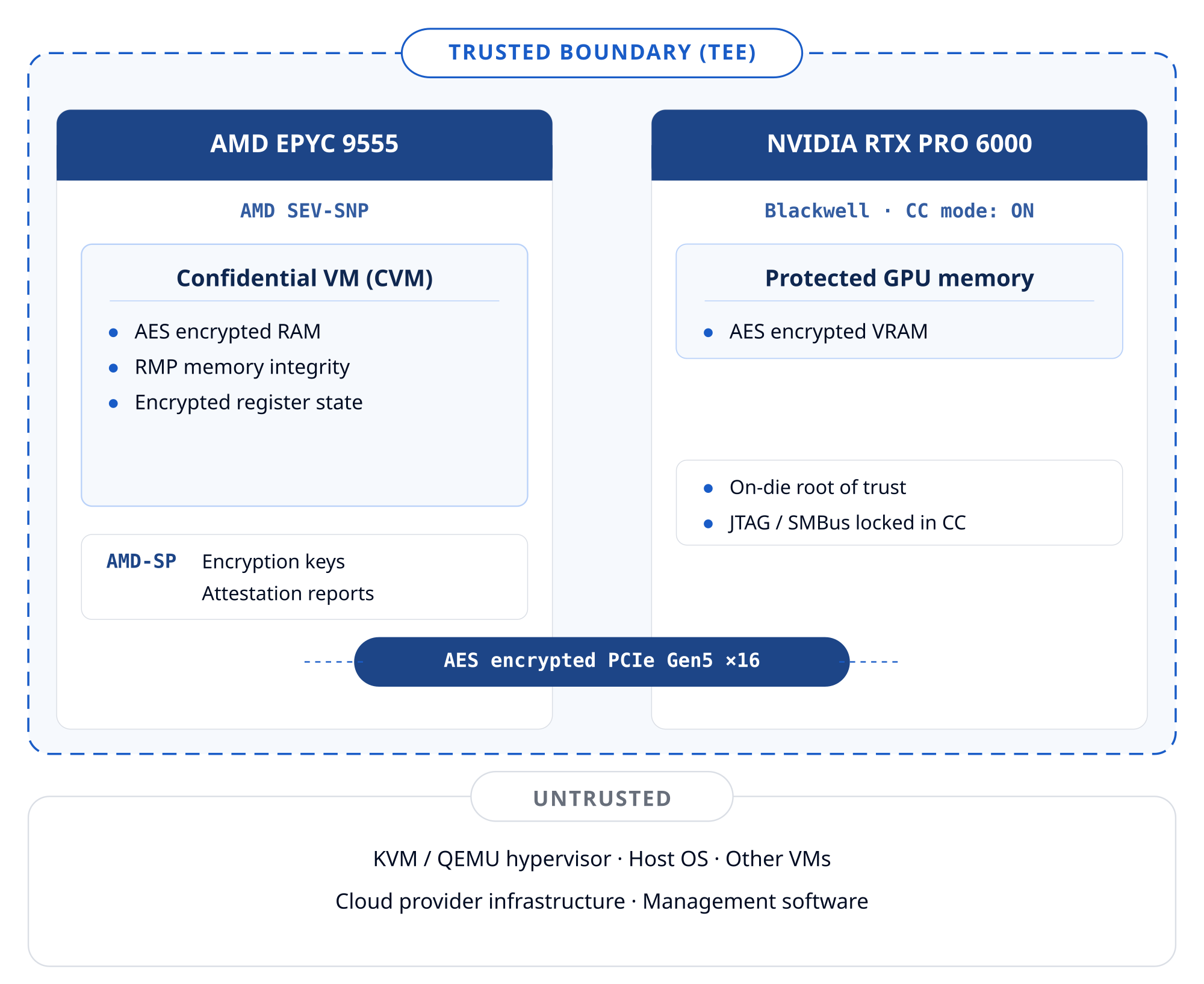 - NVIDIA Confidential Computing (GPU): the RTX PRO 6000 Blackwell GPU runs in CC mode with all ingress and egress paths protected by AES-256-GCM encryption. GPU memory is isolated from the host. NVIDIA firmware verifies its own integrity at boot via an on-die hardware Root of Trust before the GPU accepts any workload.