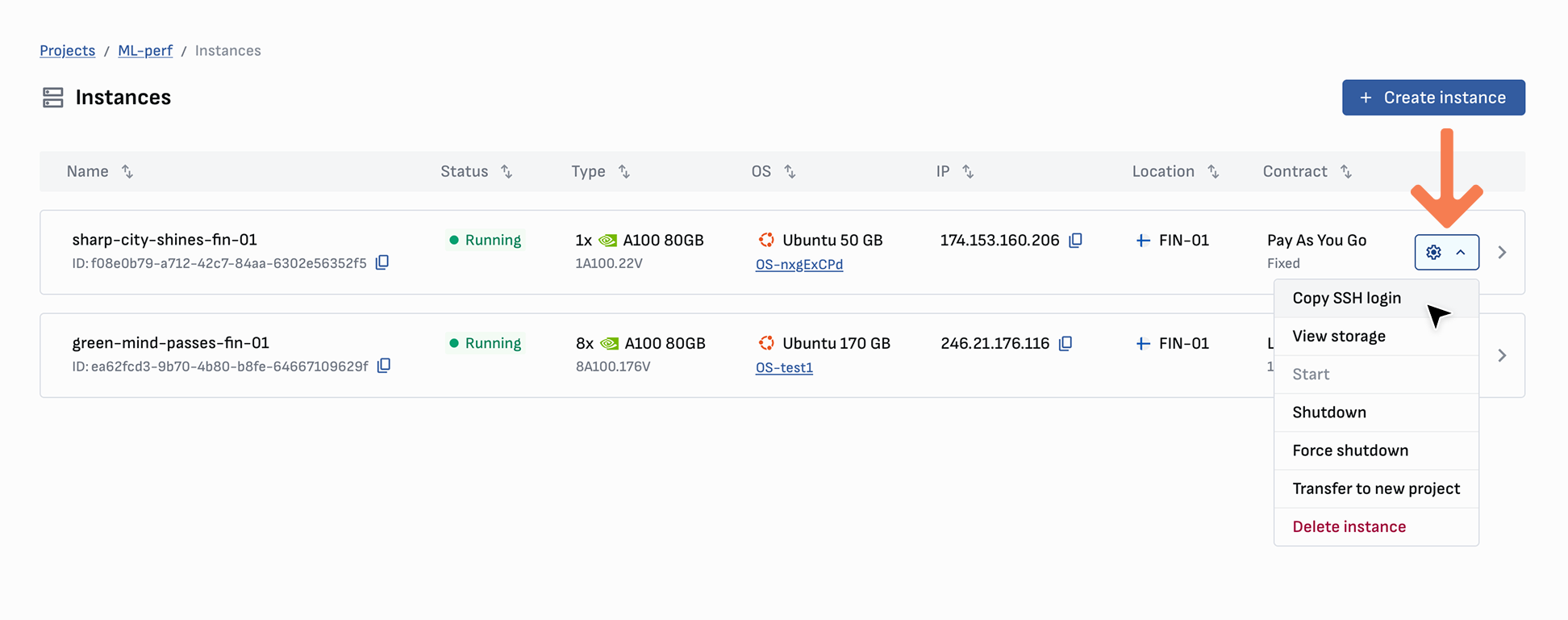 After setting up your server, you receive access using the IP address stated in the console. You can also easily copy the SSH login from the instance card or overview page.
