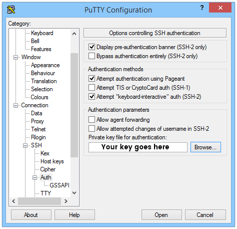 Add your server info to Putty and click Save. After saving, you will need to add your private key: