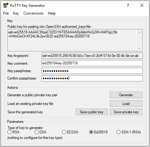 We choose Ed25519 as the type of key, and click 'Generate'. Move your cursor over the grey area, and your key will appear.