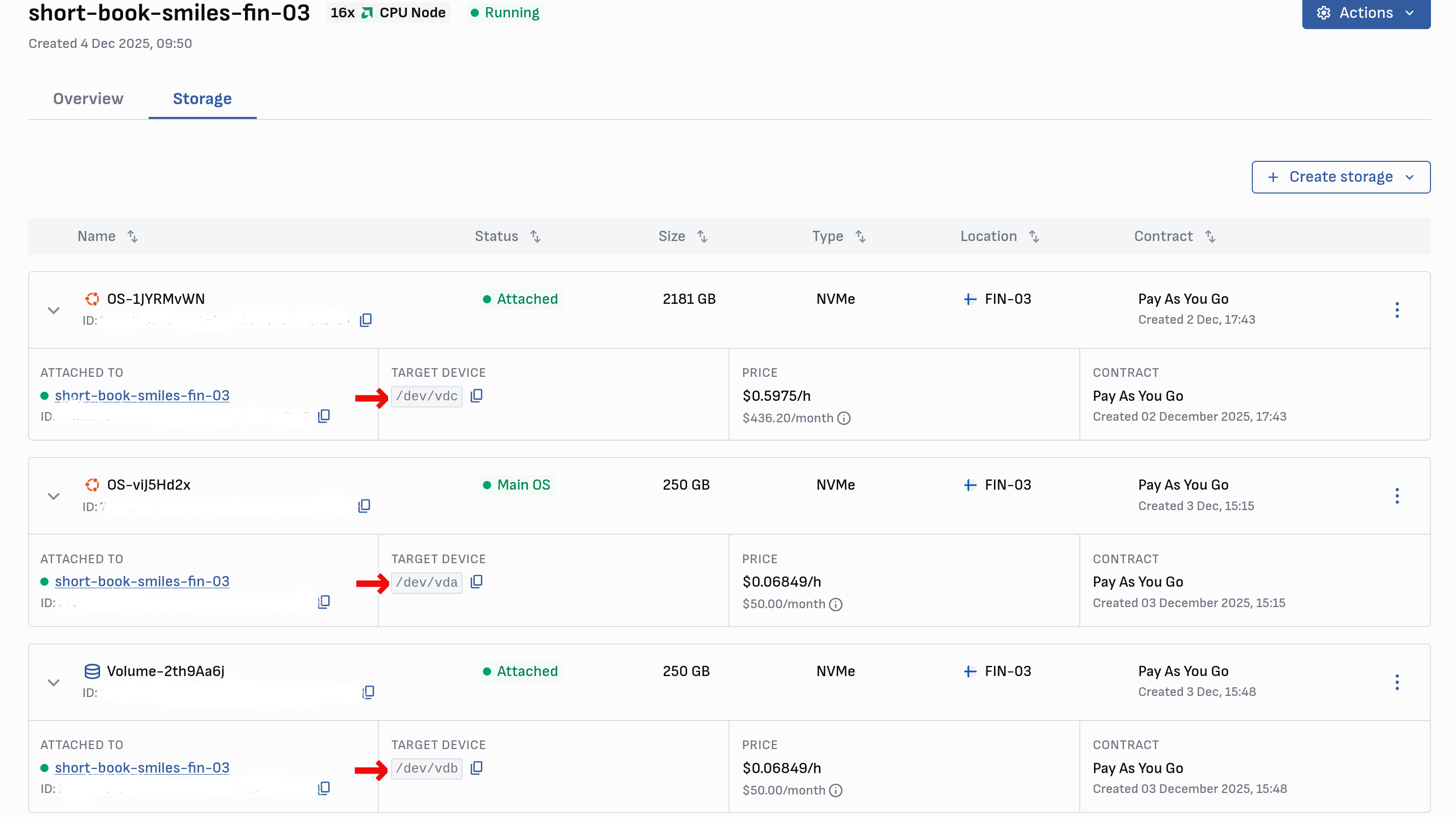 You can see the device path for each volume attached to instance in storage tab of selected instance