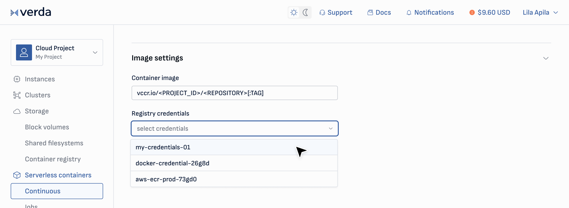 Alternatively, you can create a serverless container deployment based on your image by entering the image URL and the Verda registry credentials in the New deployment page: