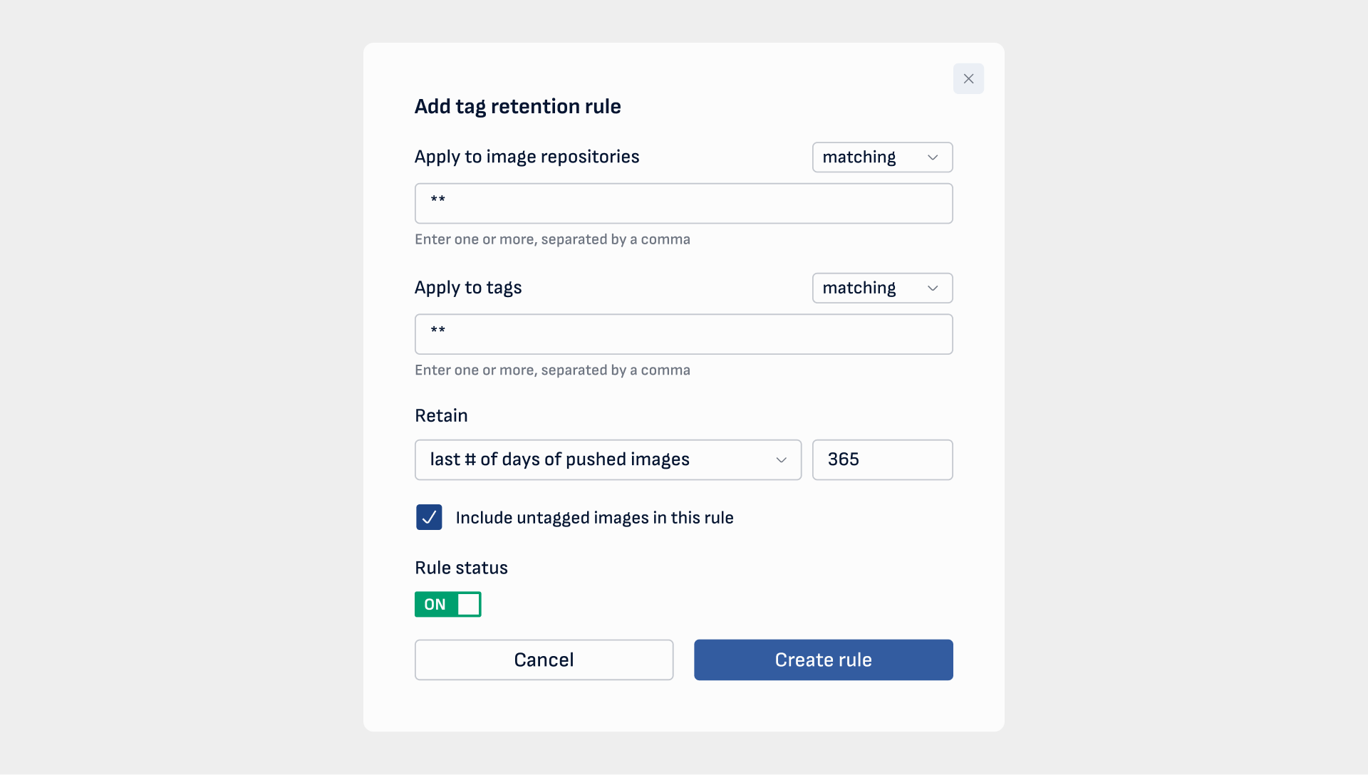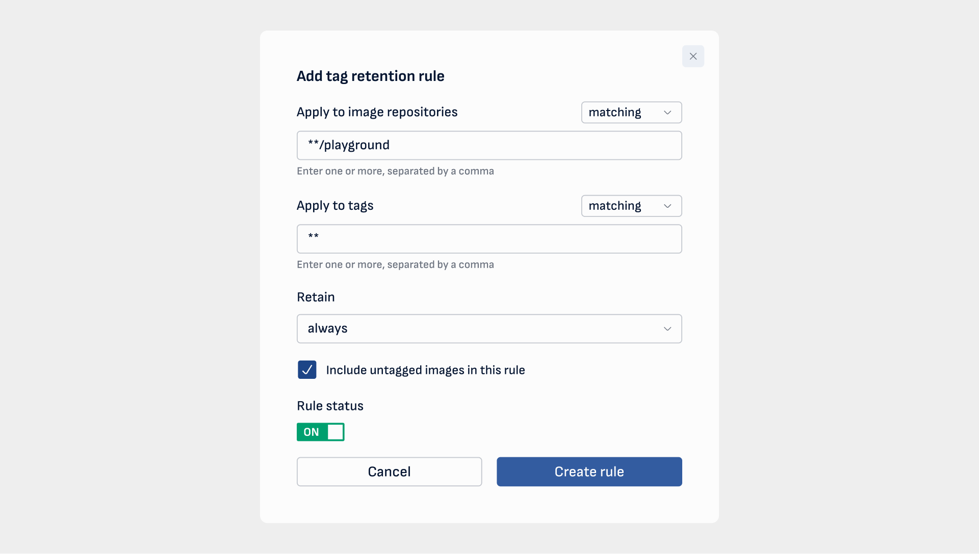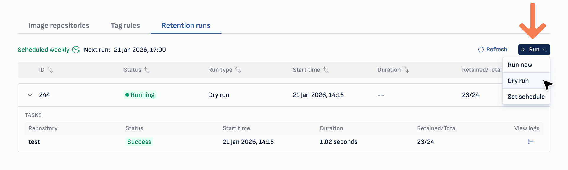 We recommend testing your tag retention rules by manually triggering a dry run to see which images would have been retained (or deleted):