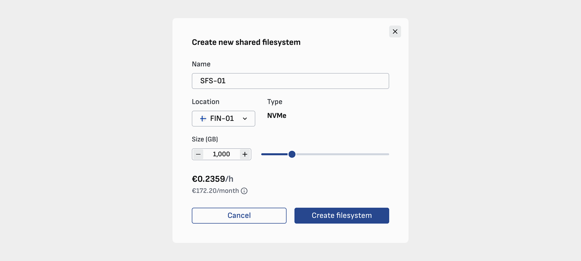 Create a new shared filesystem in two ways. One way is by clicking Create filesystem on the Shared filesystems screen. Choose your settings and click Create filesystem.