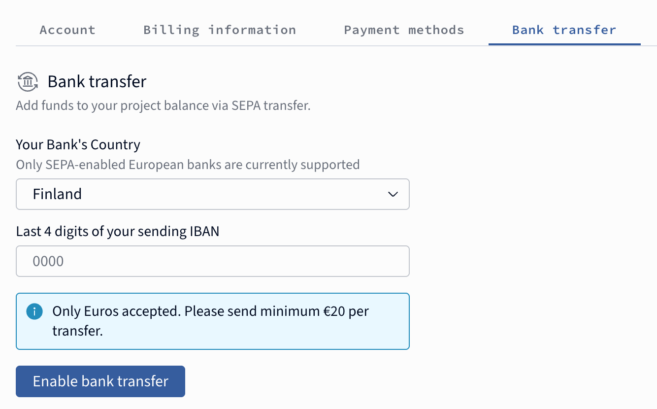 It is now possible to top up the balance using bank transfer from SEPA-enabled bank.